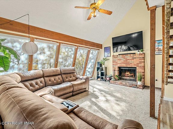 Cozy brick fireplaceAmple counter spaceBack deckVaulted ceilingsPrivate primary suiteRustic wood cabinetryStainless steel appliances