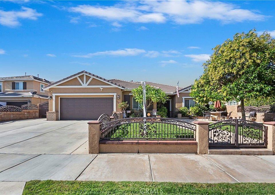 Beautifully Upgraded Turnkey Home on a Quiet Cul-de-Sac in Menlo Estates, Hemet! This stunning single-story home offers 4 bedrooms and 3 bathrooms, thoughtfully upgraded throughout. Enjoy hardwood and tile flooring, recessed lighting, crown molding, plantation shutters and energy-efficient windows. A double-door formal entry welcomes you into the spacious, open layout. The private, gated front yard includes a charming porch—perfect for relaxing outdoors. RV parking with custom gates and a large driveway provide plenty of space for vehicles and toys. The entertainer’s backyard is a true highlight, featuring a sparkling saltwater pool and spa, a full wrap-around covered patio with stamped concrete, a mounted TV (included), and a BBQ island with a stainless steel refrigerator and 4-burner grill. Inside, the living room offers a cozy fireplace, built-in entertainment cabinetry, and a mounted TV (included). The kitchen boasts a large center island with bar seating, a spacious pantry, stainless steel appliances and an open-concept design ideal for gatherings. The primary suite offers a large walk-in closet, soaking tub, walk-in shower, and dual sinks—with a mounted TV included. The front bedroom has been converted into a home office but can easily be restored to a bedroom if desired. Additional features include a large laundry/utility room, a two-car garage with pull-down ladder and attic storage, soft water system, tankless water heater and no HOA. Schedule your private tour of this beautiful Menlo Estates home today!