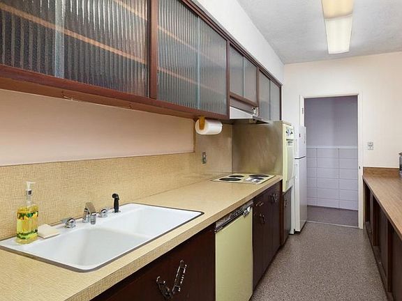 Kitchen with refrigerator, cook-top, oven, dishwasher + dryer.