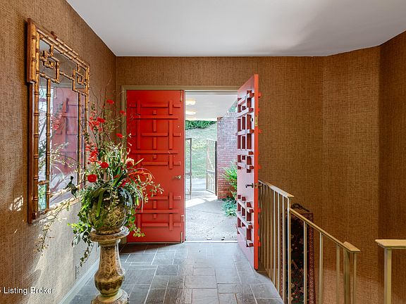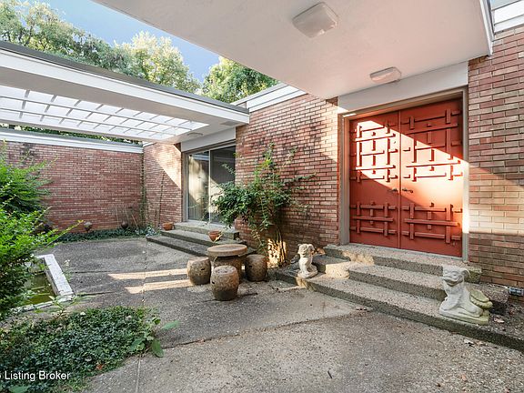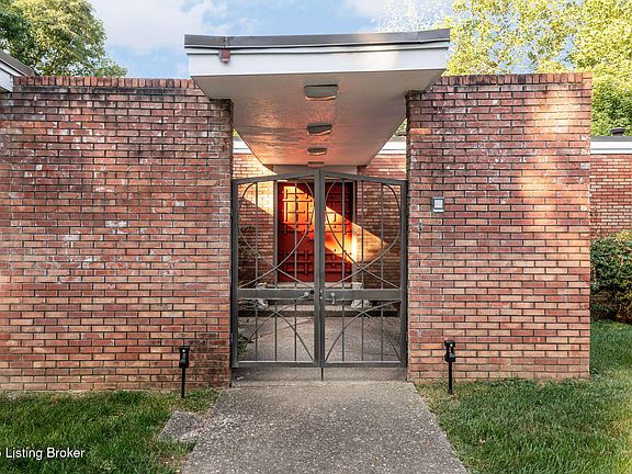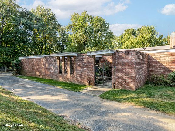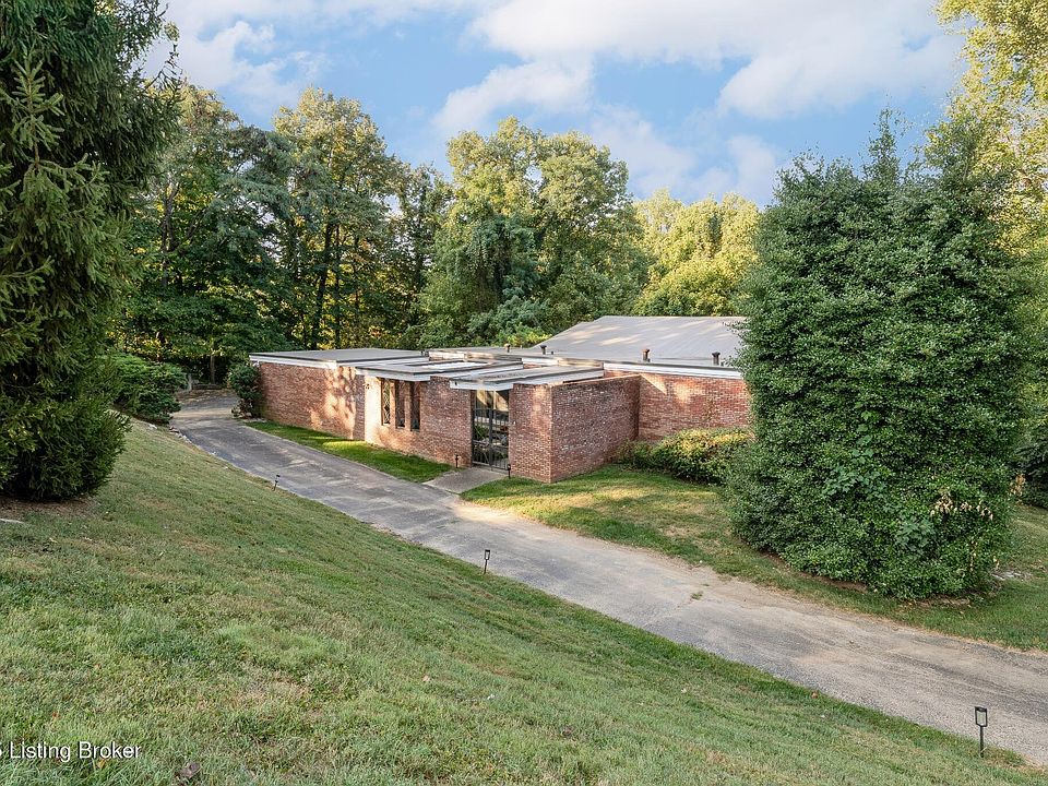 Discover this truly unique one-owner, custom-built, mid-century modern ranch in the desirable Greenleaves neighborhood, offering the perfect blend of privacy and convenience. Built in 1970 and meticulously maintained, including a new roof in 2025, this home is situated on 1.3 wooded acres in the city, just minutes from I-71 and Brownsboro Road. As you approach, a large gated courtyard welcomes you to the double-door entry. Inside, the spacious foyer opens to a vaulted living room featuring a dramatic floor-to-ceiling fireplace and expansive windows overlooking the wooded lot, bringing the outdoors in. The eat-in kitchen offers generous space, a large pantry, built-in desk, and ample cabinetry. The primary suite is a true retreat with floor-to-ceiling windows, a cozy fireplace, oversized layout, and spa-style bath complete with double vanity, sunken tub, and a huge custom walk-in closet with built-in drawers and cabinetry. A stylish powder room completes the first floor.