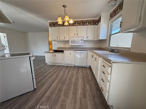 Cute as a button and sitting pretty on a corner lot! This open-concept floorplan feels light, bright and spacious. At the top of the park, this has a premium location with tons of off-street parking and yard space. New flooring, new paint inside and out, roof recently re-sealed and with bonus features like thermostat-regulated fireplace/stove and enclosed porch perfect for additional living space, exercise space, den or office. Indoor laundry just off the kitchen. New tile floor in the guest bath. Lemon tree and mature hedges to buffer views from the street. Park features many amenities like swimming pools, park/play areas, and optional RV storage.