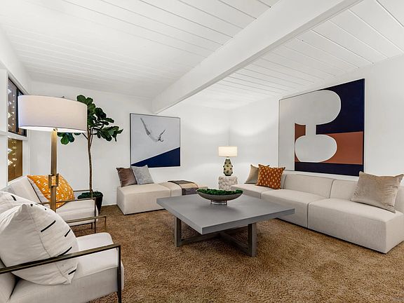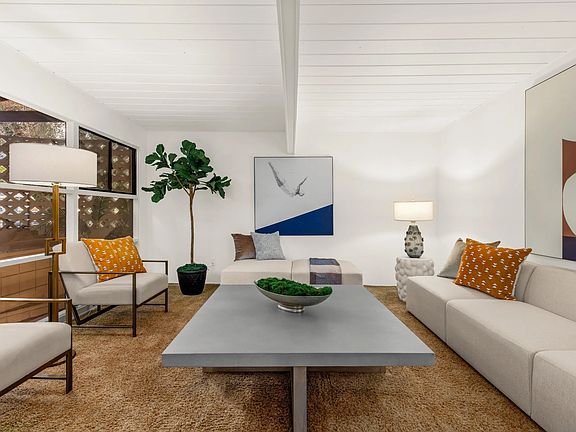 This mid-century modern gem has a unique and timeless vibe. This single level patio style home offers vaulted ceilings, gas fire place and a spacious layout perfect for entertaining. Architecturally interesting windows, planked wood ceilings, wood paneled powder room, and cinder block designed exteriors make this home special to the era and perfect for a modern update. Four bedrooms and two and a half bath, with two living areas gives versatility to the use of the home, however, the stand out feature is as you walk to the back patio into a landscaping masterpiece. This oversized lot allows for zen like outdoor living and a possibility of of adding an ADU or exterior expansion. This home is centrally located with an approachable price point.