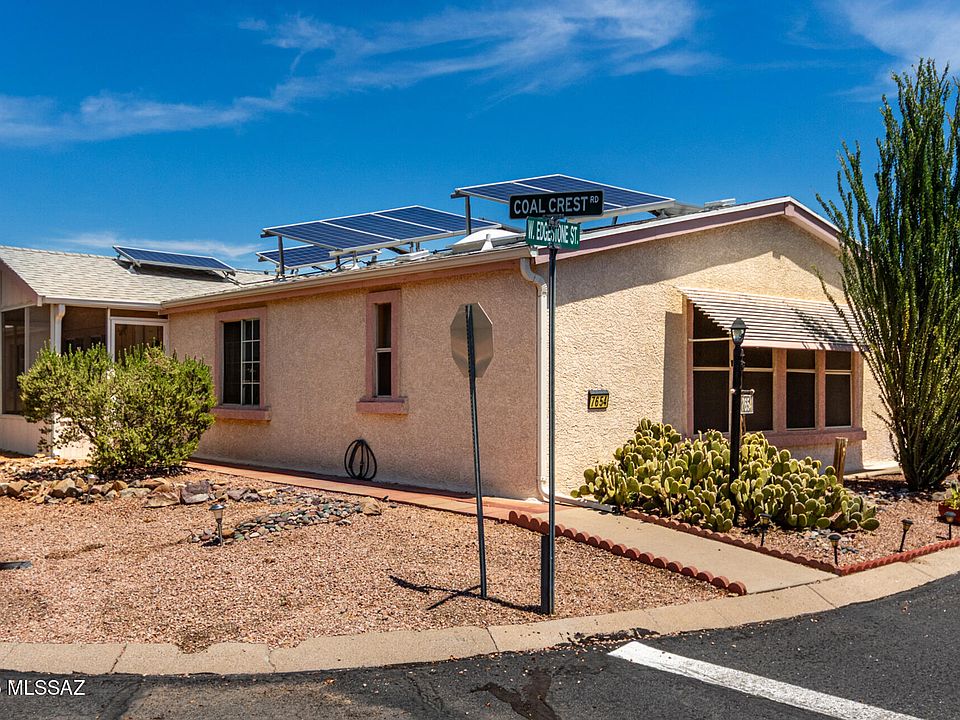 FULLY OWNED SOLAR! This gem is located in Copper Crest, a vibrant 55+ active adult community in Tucson. Featuring energy-saving solar panels (paid off), granite countertops, a new roof, updated stucco, and fresh flooring throughout. The spacious living areas are filled with natural light, creating a warm atmosphere. Copper Crest offers amazing amenities, including a clubhouse, fitness center, pool, spa, bocce ball courts, and a dog park. With easy access to shopping and dining, and a wealth of recreational options, this home offers incredible value. Schedule a showing today!