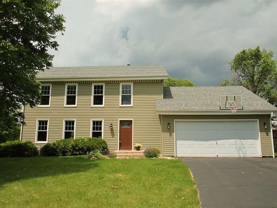 Home sweet home! Spacious home features large living room and dining room with wood laminate floors. Large eat in kitchen with generous cabinet space, tile, new granite countertops, breakfast bar and opens to the family room with wood burning fireplace, slider to deck, a patio and huge back yard with shed. Updated powder room with granite counter completes main level. New carpet upstairs! Nice master suite with two large, extra deep closets and bathroom with shower! Updated additional bath upstairs has granite counter, new flooring, and light. 3 more bedrooms up! Lower level is partially finished with a large rec room and a bedroom with an egress window. Lots of storage space! Many rooms have been freshly painted! All appliances stay. HSA Home warranty. Home is situated on a .69 lot with mature trees. Minutes to I90 interchange. Roscoe/Hononegah Schools. Close to golf course.