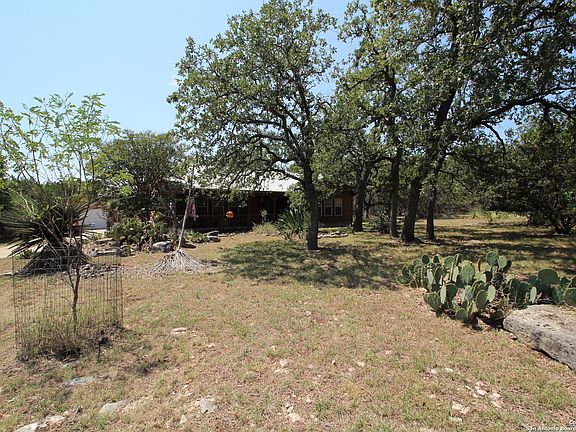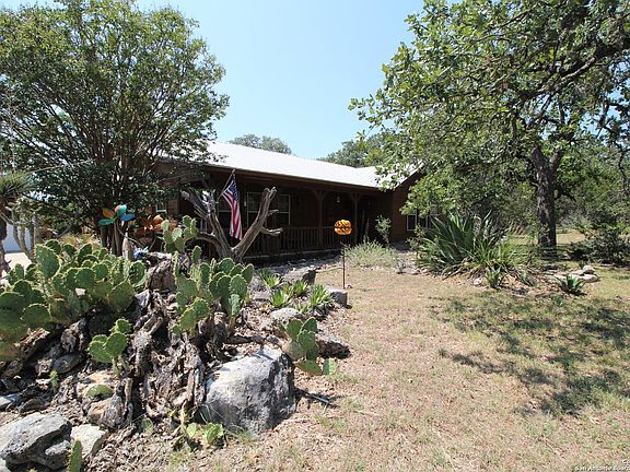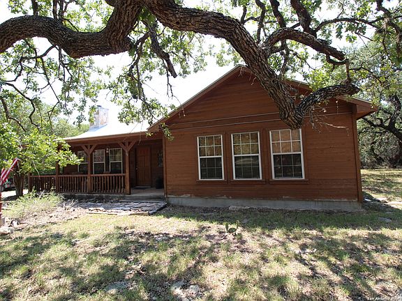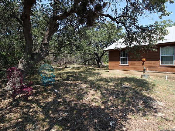 Here is your Texas Hill Country Home! This rustic home is nestled on a 0.94 acre double lot and is filled with tons mature trees and cactus. The large front porch has plenty of space for outdoor furniture and plants. The moment you walk in you are welcomed into the living room with beautiful wood flooring and a cathedral ceiling with exposed beams. The stone fireplace draws your attention and is perfectly placed in the room. The bedrooms are on the right side of the house and the master is split from the secondary rooms. The master bedroom is huge with plenty of space for a sitting area too. Two large master closets and a full master bath. Off of the living room is the dining room and kitchen. The kitchen has lots of cabinet and counter space. The countertops in the kitchen are quartzite. The back of the house has a incredible screened in patio with saltillo tile. The 2 car garage is detached and can be used as a workshop too. Recent updates are the HVAC system and travertine tile in kitchen. The neighborhood amenities include- Pool, Playground, Pavilion, BBQ pits, Tennis, Basketball, Volleyball, Medina River Park which is great for swimming, fishing, and hiking!