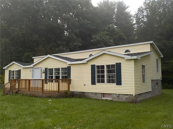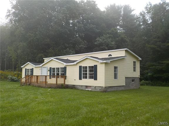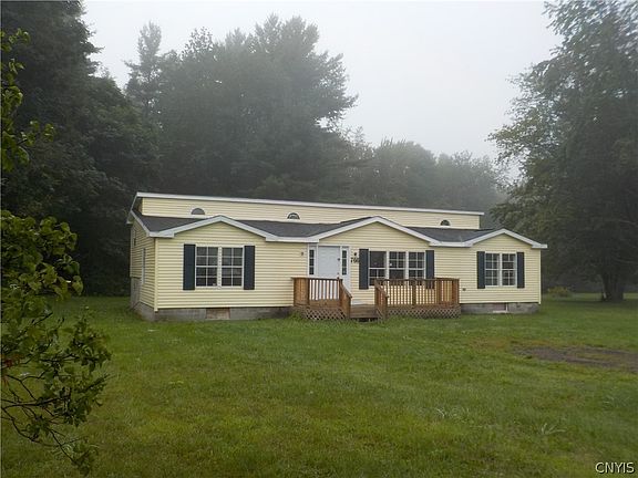 This is a ranch/split level, 3 bedroom, 2 bath house with large living room, master bedroom and master bath, laundry room, kitchen with dining L with sliding glass door to rear covered deck; all on 5 wooded acres. Square footage is 1358 sq. ft. as per owner. Cato-Meridian schools, country setting, Duck Lake 1/4 mile away.