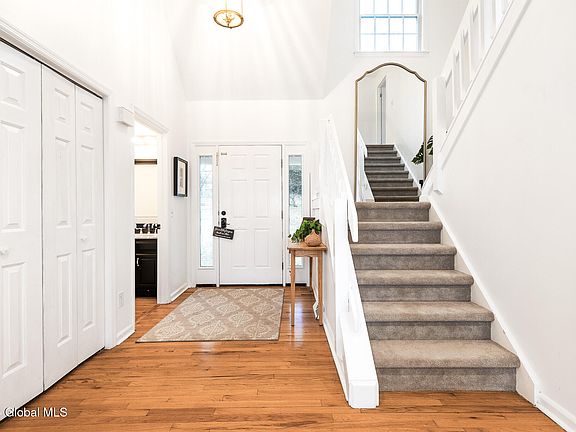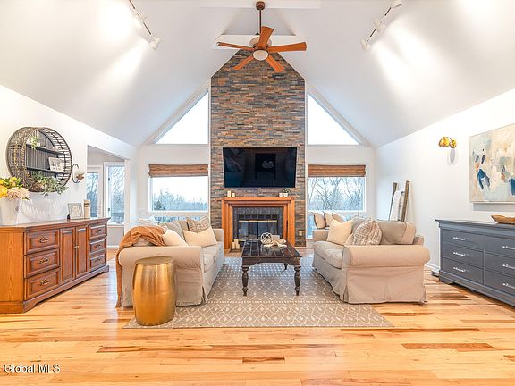 OFFER DEADLINE 10AM MON. DEC 23. You must see this gorgeous 5-6 bedroom chalet overlooking a beucolic, private backyard on 6.34 acres with views of the Green Mountains. Perfect property for horses! Impressive foyer entrance opens to the spacious and bright living room with cathedral ceilings, fireplace and wall of windows looking out at the view. Convenient first-floor primary, office/bedroom, mudroom and laundry. The full & dry finished basement with a 3rd full bath adds ~1,500 more sqft and walks out to a private patio; the perfect layout for a guest or in-law suite. Enjoy peace of mind with an attached garage, public water, central air, a newer roof, newer furnace, refinished/added hardwood floors, and other brand new flooring. Welcome!