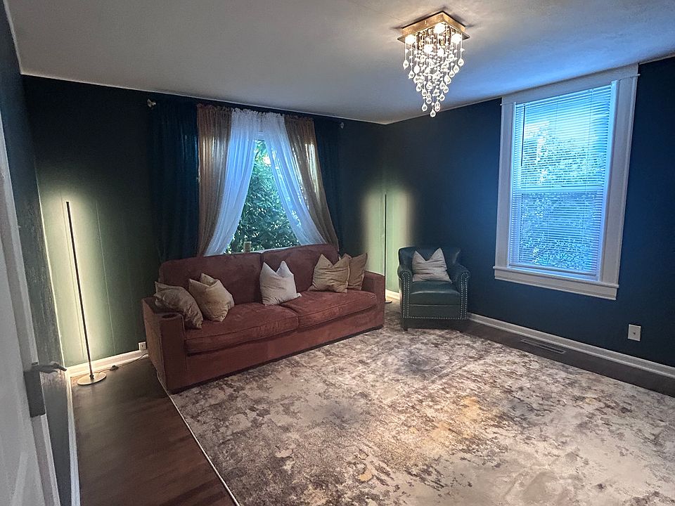 Step inside to discover a bright, spacious living space filled with natural light, accented by artistic wall murals, unique room color palettes, and decorative lighting. The gourmet kitchen features granite countertops, restored cabinetry, new stainless steel appliances, a dishwasher, and a microwave perfect for both casual meals and entertaining.