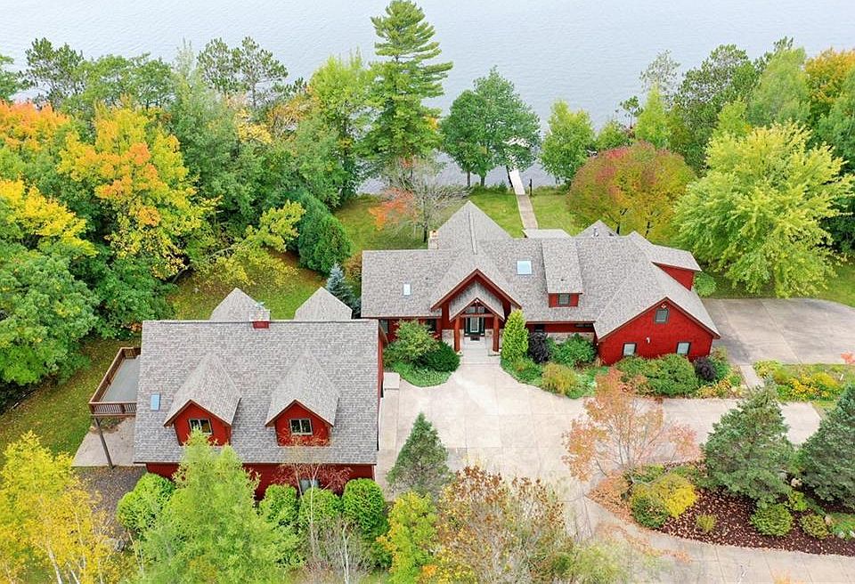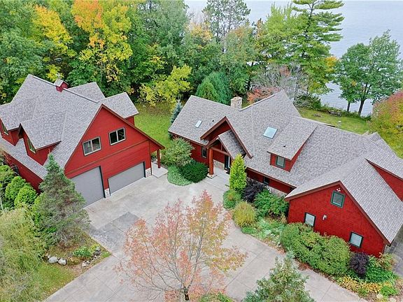 This is a classic Northwoods lake lodge home. Massive timbers blend into custom log and wood construction with hand-carved highlights. Main floor Master BR suite. 2nd floor bonus room is 450 sf of possible uses. Professionally landscaped lawn and gardens offer sunset views from anywhere on your 356 feet of lake level shoreline located at the end of a private road. Detached 5 car garage with an RV sized 3rd stall with 16 ft ceilings and ready-to-finish 1100 sq ft upper level. A rare find on LCO!