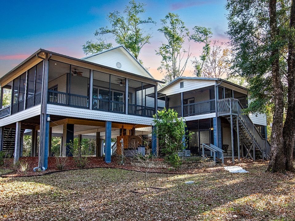 LISTED BELOW RECENT APPRAISAL VALUE! This beautiful river front home was built in 2016 and sits on 4.61 acres in a gated community just 2 miles from Gibson Park’s Suwannee River public boat ramp. The main home offers 2 bedrooms, 1 bath, hardwood floors, and an open living area with floor-to-ceiling glass doors. Two full walls of glass retracts behind the exterior walls, opening the living room to the wraparound screened deck/porch. The custom kitchen includes granite countertops, stainless steel appliances, brand-new dishwasher, and a large pantry. The Primary bedroom features a large walk-in closet and bathroom with double vanities and a tiled shower. Connected by the screened porch/deck, a guest cottage was added in 2023, giving you 2 more additional rooms and a full bath, ideal for visitors or multigenerational living. Exterior features include an elevator, outdoor shower, fire pit area, a large screened patio with half bath, oversized 2-car carport, GenX generator, water softener, pole barn, shed with electricity, and RV hookup. RV hookup wiring is present; breaker was redirected for the elevator and can be reconnected. Located approx. 15 minutes from I-75 and I-10. If you've been looking for your peaceful escape, come take a look today!
