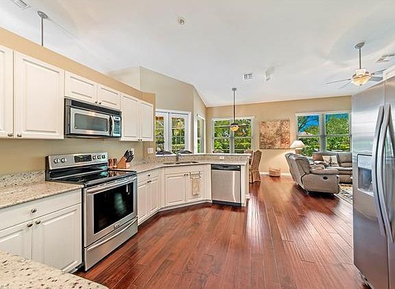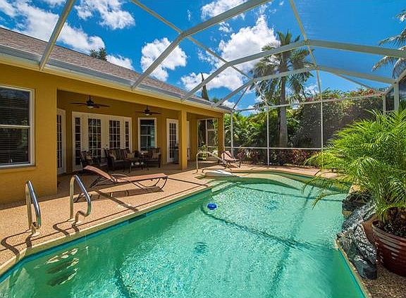 Awesome pool home on over-sized corner lot with well appointed & spacious floor plan. Enjoy fantastic outdoor living, undercover patio looking over the custom pool with relaxing water fall feature, screened lanai + lush landscaping and large yard to the side. This home is nicely maintained & offers lots of updates, high end hand scraped Brazilian Walnut hard wood flooring though main living and bedrooms. Entry foyer opens to a large open Living & formal Dining w/ volume ceilings & french doors to lanai. Spacious kitchen with granite counters, breakfast bar, stainless appliances opening to casual dining & Family room & more french doors opening out to patio. Master bedroom suite, french doors, walk-in closet & thru to master bath suite. Split guest bedrooms (one currently being used as office w/ walk in closet) with full bathroom. All this plus feature covered front porch and sought after 2 car side load garage. Located in the popular Orchards community w/ Community pool, tennis courts, exercise room & LOW HOA Fees currently $375 per quarter! Centrally close to Mercato, Waterside, 5th Ave, I-75 & all Beaches plus in top Schools zone!