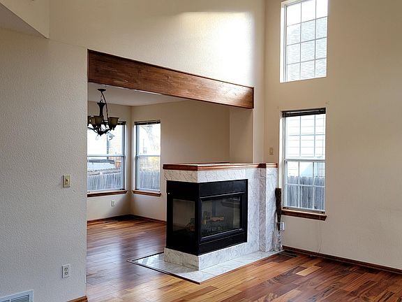 Gather with your family around the gas fire place in the large living room with vaulted sealing and tall panoramic windows. The honey-cherry hardwood floor just adds to the warmth of the house.