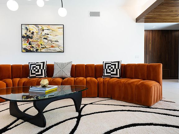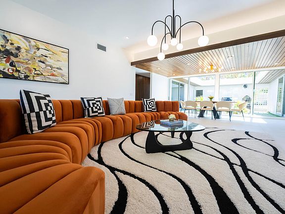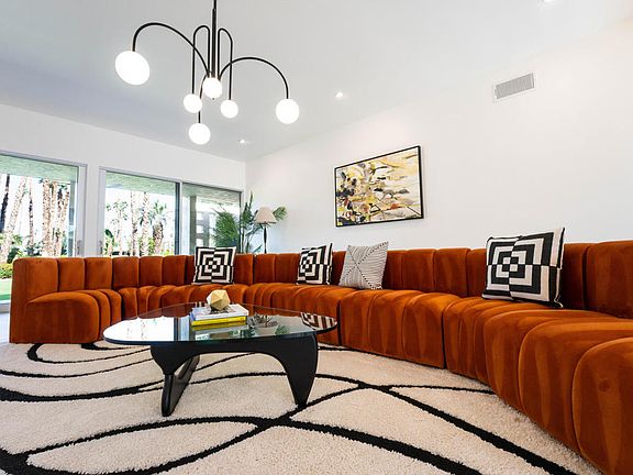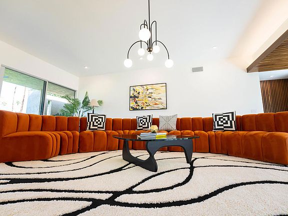 Mid-century enthusiasts, have your cake and eat it too! Absolutely stunning, completely remodeled William Krisel original design villa located in the sought-after historical landmark of the Sandpiper Community within Indian Wells Country Club. This exquisite property has been thoroughly re-imagined, blending modern elegance and amenities while preserving its unique architectural history that embodies the charm of desert living. As you enter through the elegant double-door entry, you'll find yourself in a stunning foyer, complete with a custom-built accent wall that truly stands out. Step into the expansive great room with beautifully-crafted walnut wood-slat detailing & a quartz wall surrounding the fireplace & wet bar, creating a warm inviting atmosphere. The dining room is a masterpiece, framed beneath a suspended ceiling that highlights the same beautiful walnut detailing. The modern & elegant kitchen is a true chef's dream featuring a stainless-steel Dacor full-size individual refrigerator & freezer, along with a glass front wine refrigerator for your favorite vintages. A GE Monogram 6-burner gas range ensures you have all the tools you need to create culinary masterpieces. An oversized island adorned with a vibrant quartz counter top anchor the room, making the space both functional and stylish. Retreat to the spacious primary suite...a spa-like oasis features a walk-in shower, a relaxing Roman tub, oversized vanity adorned with quartz countertops plus custom lighting. A large walk-in closet offers ample storage space. Meticulously designed, this retreat is a perfect blend of opulence and functionality.2 additional en-suite bedrooms are equally spacious & luxurious offering large vanities plus walk-in shower with glass doors offering comfort and privacy for family or guests.At the heart of the home lies an inviting atrium patio, perfect for entertaining and relaxation featuring a built-in gas grill and outdoor kitchen! Natural light pours in, brightening the entire home creating a warm, welcoming atmosphere. Additional features include a 4-step water filtration system, solar energy panels, epoxy flooring in garage, nicely updated laundry room with utility sink, 2 on-demand hot water heaters, LED lighting, ALL New windows/sliders with phantom screens throughout and much MORE!