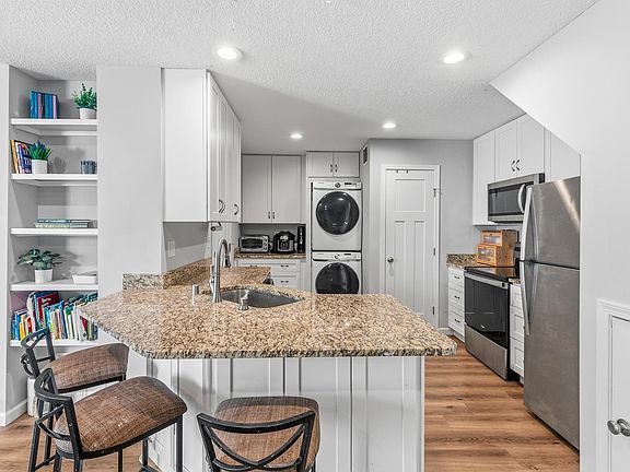 The stunning kitchen features custom white cabinetry, granite countertops, and sleek stainless steel appliances—perfect for cooking, hosting, and everyday living. The open-concept living area includes a gorgeous electric fireplace framed with built-in shelving, adding both style and warmth. Knockdown ceilings and recessed lighting run throughout the home, enhancing its clean, contemporary feel.