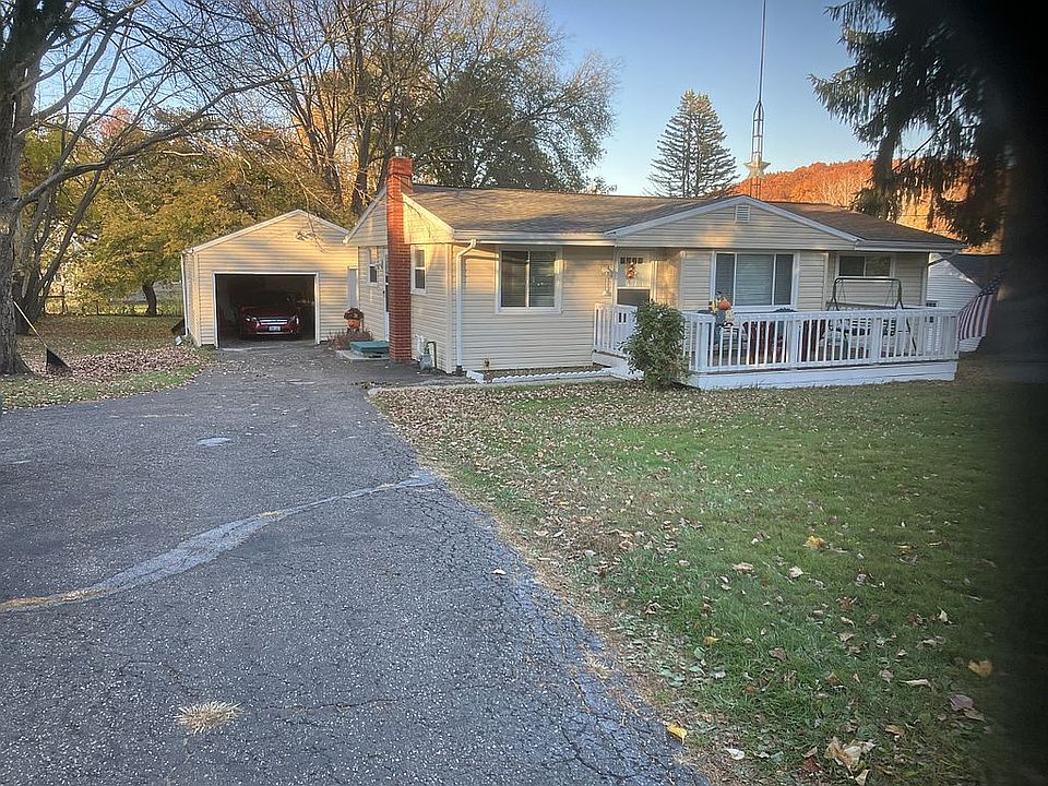 3 bedroom ranch, 3/4 finished basement with glass block windows, 1 bath, hardwood floors refinished in 2018, decent kitchen, good size dining room, larger living room, fresh double hung windows and vinyl siding, detached 1.5 car garage, natural gas heat, almost 3/4 acre lot, asphalt driveway with a turnaround, 12’ by 24’ wood front deck with railing, 10’ by 32’ back cement patio.