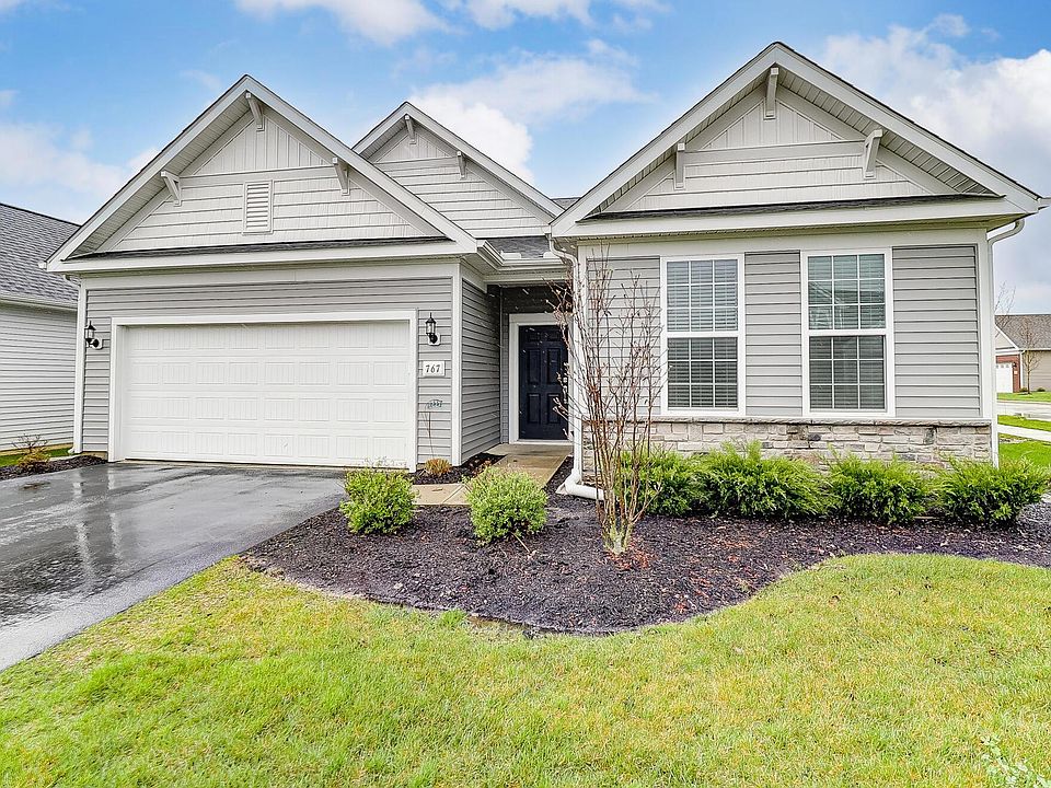 Welcome home! Wow this Pulte low maintenance home is better than new with options galore. 2 BR, 2 Full Baths, plus dedicated den or home office or potential third BR. Stunning kitchen with oversized Island. S/S appliances, 42'' cabinets with soft close hardware and pull-out drawers. Beautiful quartz counters and walk in pantry. Primary bedroom suite with dual sinks, separate water closet, and large shower & tub. Two car garage with an additional full tandem bay for another car or storage. Great location just minutes from the Sunbury, Library, Shopping and Restaurants. Just minutes to Polaris and Westerville. Community pool, sidewalks, park & walking paths. HOA also includes grass mowing, fertilization, and mulch.