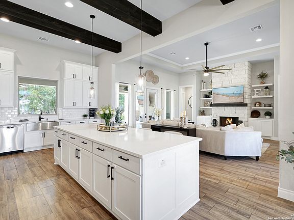 HOME HOUSE SATURDAY 1/25 1-3PM. Step inside & fall in love! This home is designed for entertaining, with an open concept layout that flows effortlessly. The chef's kitchen, open to the family room, is a culinary dream featuring an oversized breakfast bar w/ quartz countertops, double ovens, gas cooking, & abundant cabinet space! The Family Room features a gorgeous limestone fireplace, elegantly framed by custom built-ins that add warmth & character. Adjacent to the family room, is a spacious game room & private study w/ sliding barn door entry. The Owner's Retreat is thoughtfully separated from the secondary bedrooms, offering both privacy & luxury. The spa-like bathroom boasts stunning floor-to-ceiling brick-patterned tile, a freestanding garden tub, & an extra-large walk-in shower w/ dual & rain showerheads. Step outside to the extended covered patio, featuring a tongue-and-groove ceiling & a second limestone fireplace, creating the perfect ambiance for outdoor gatherings.
