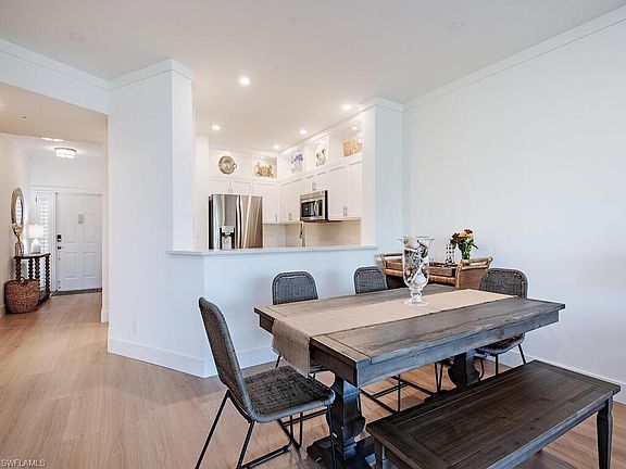 Palm trees, lake views and sunset skies are waiting for you to come and enjoy this special residence. Beautiful quality renovations have just been completed in 2023-2024. Clean lines of new luxury laminate flooring, new lanai tiles, new solid doors, new hardware, baseboards, crown molding and door casings all have been replaced. The walls were all resurfaced (smoothed) primed and walls and ceilings painted. The kitchen has added new custom upper box cabinets and a glass bar with a wine cooler. New lighting ,fans and the list goes on. The tram station to the beach is a quick walk directly across the street and will take you to the private resident north or south beach and restaurants. .So many amenities to enjoy, beach front restaurants, fitness center, tennis courts, biking and recently approved pickleball courts to be built this year are all here in Pelican Bay. Enjoy Artis of Naples perfomances , Waterside Shops, Mercato Shops and many upscale restaurants are a five minute ride.