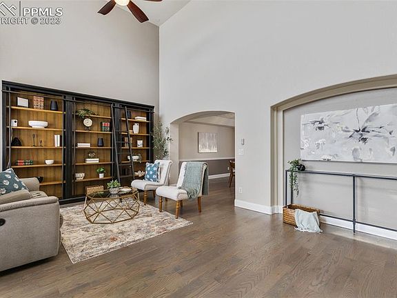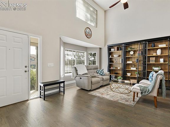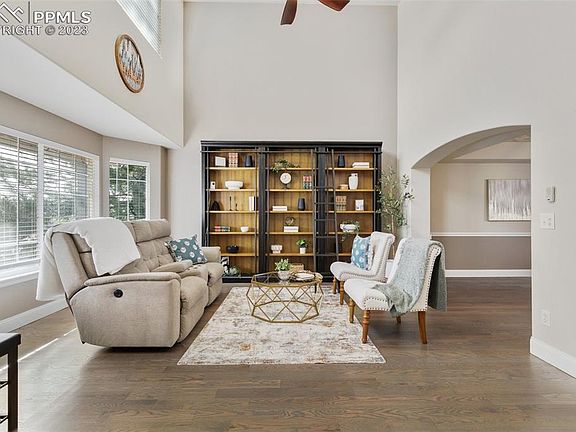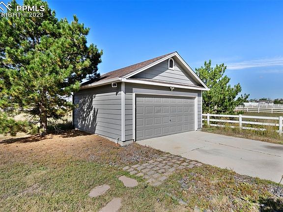 Beautiful 2-story Home that sits on over half an acre in Woodmen Hills. It has Incredible Mountain views, a 3 Car Attached Garage, and a second 2 Car Garage/Work Shop in the back bringing the total garage spaces to 5 along with gated parking for your RV on the side! Model home quality & upgrades throughout. The main level features: Formal living and dining rooms; spacious eat-in kitchen w/granite counters, custom cabinets, breakfast bar, island & pantry; Family Room w/cozy gas fireplace, built-ins, and a wall of windows; Office w/French Doors; 3/4 Bath & large laundry area w/utility sink. A grand stairway w/wrought iron spindles leads you to the upper level. Upstairs you'll find a versatile loft overlooking the Family Room. A closet in the loft area makes this an easy area to convert to an additional bedroom. The Enormous Master Suite is accessed through a double entry and has vaulted ceilings, Pikes Peak Views, an attached custom-tiled 5-piece bath, and a walk-in closet. Two additional bedrooms share a full bath. Lots of room for storage in the basement that is already framed for a 4th Bedroom and 4th bath. The framing, plumbing, and electrical are all there, it just needs the finishing touches! Very convenient location for walking! Grocery stores, Post Office, Dentist, and multiple restaurants along with a brand new King Soopers are easily within walking distance. This home also comes with a whole home humidifier, washer and dryer, and beautiful library shelving along with many other updates!