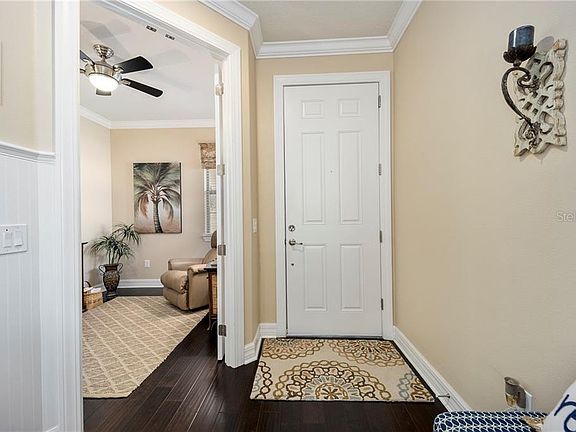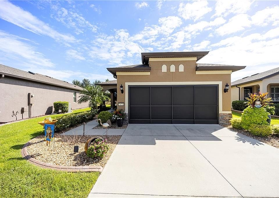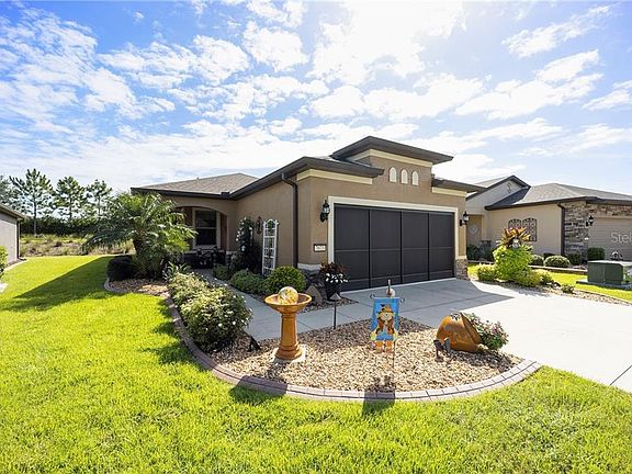 Taft Street, 2/2/2 plus a den/office with extended garage and a sunroom (a rare find). This home is absolutely beautiful and immaculately kept. You will fall in love with the welcoming landscaping and the tastefully decorated interior. Exterior has custom landscaping with cement decorative curbing, Stone accents on house front, storm/screen door, extended birdcage with pavers, exterior freshly painted, screened garage with epoxy floor, 2 overhead lights in the garage, and additional outlets have been added. Inside you will find crown molding throughout, wainscoting in living room and hallway, 8' Cheyenne doors, a dream kitchen with Stainless Steel appliances, granite counter tops, island with storage and seating, pantry closet with added shelving, pendant lighting, and additional light over the sink. Master bedroom features ensuite bath and walk-in closet. Baths have comfort height cabinets and commodes, and tiled showers. Inside laundry room with cabinet storage. Ceiling fans, engineered wood flooring in great room, kitchen, sunroom, ceramic tile in baths, carpet in bedrooms. Lawn maintenance is included in the monthly HOA fee allowing more time to enjoy all the fantastic amenities offered in Del Webb's Stone Creek community. Come take a look at this beautiful home and community, you won't be disappointed!