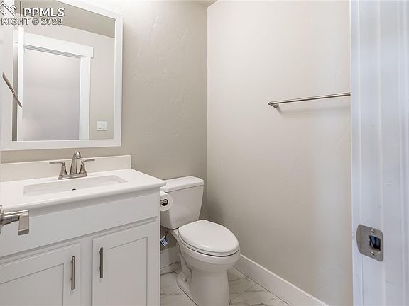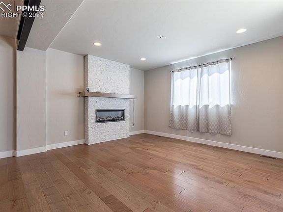 This "like new", modern and deceptively large townhome boasts builder upgrades and some stellar mountain views. Enter to an open living room that features stacked stone, linear fireplace with mantle. Upgraded engineered maple hardwood floors throughout the main level. Open concept Living, dining and kitchen areas. Kitchen has a large quartz island for eat in dining. Access the covered back patio and private backyard via slider at living room. Half bath on the main level is near garage entry. Upstairs, is a spacious primary suite with walk in closet and 4-piece bath (includes double vanity). Second bedroom upstairs is just off the loft..could be an office or 2nd living room. Enjoy unobstructed views of Pikes Peak from the deck, just off upper loft area. Laundry room is conveniently located upstairs and has built in shelving. Third bedroom is in the basement. Second living space and wet bar complete this space. Future, 11-acre Aspen Meadow Park will be within a short walk. Quick access to dining, shopping, parks, trails, schools, Powers Corridor, and many more!
