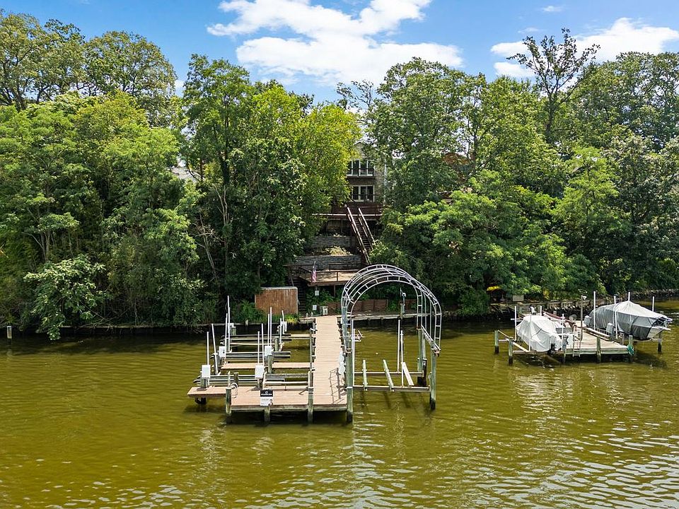 Beautifully remodeled, this stunning waterfront Colonial in sought-after Green Haven offers direct navigable access to Stoney Creek and breathtaking views from nearly every level. Tucked along the shoreline, the home presents an exceptional opportunity for water lovers with private multiple-slip docking and an inviting outdoor setting that embraces relaxation. The home makes a striking first impression with a large front driveway, manicured landscaping, and gorgeous curb appeal enhanced by stone accents. Inside, the light-filled living room features rich hardwood flooring and a cozy pellet stove. The eat-in kitchen is both vibrant and functional, showcasing blue cabinetry, granite countertops, a stone backsplash, stainless steel appliances, a pantry, and an island with bar seating. A cozy breakfast nook opens seamlessly into the spacious family room, where an accent wall, expansive sliding glass doors, a convenient powder room, and sweeping water views create a truly special space. Also on the main level is a bedroom with a full bathroom nearby, ideal for guests or multigenerational living. Upstairs, the luxurious primary suite is a true retreat, featuring soaring cathedral ceilings, dual ceiling fans, a stacked stone gas fireplace, and a private balcony with water views. The en suite bath includes a corner jetted soaking tub, a separate glass-enclosed shower, a dual-sink vanity, a skylight, and dual access from the hallway for added convenience. A custom walk-in closet with built-in organization completes the suite. An additional spacious bedroom and a laundry area in the hallway round out the upper level. The fully finished lower level adds even more flexible living space, including a large recreation room with luxury vinyl tile flooring, an accent wall, and walk-out access to the exterior. There's also a sitting/foyer with a full bathroom and a bonus room with its own walk-out access—ideal as an office, studio, or guest space. Step outside to discover the ultimate waterfront lifestyle. A tiered deck with a pergola and built-in bar area offers the perfect setting for entertaining, while a side patio wraps around to the front driveway. Beautifully maintained decking and retaining walls thoughtfully constructed in 2022, enhance both the aesthetics and function of the outdoor space. Follow the steps to the lower deck and private dock, complete with multiple boat slips. With deep water access—measuring approximately 8 feet at low tide from the top of the pier—even large boats can easily navigate the waterways right to the property, offering seamless access to Stoney Creek and the open water beyond.