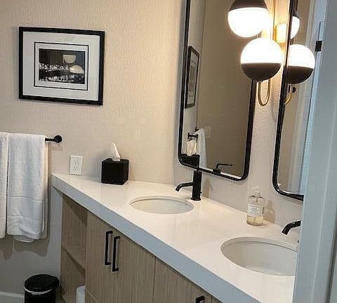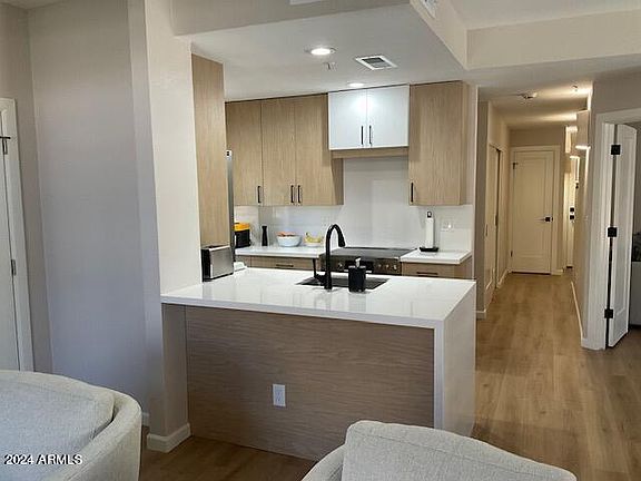 One of a kind luxuriously remodeled ground-level condo in the heart of Scottsdale. This beautiful 2BR/2BA home has so many upgraded features from the 2023 gut remodel that you'll feel like you are in a model home listed at twice the price. The stunning kitchen features brand new high end cabinets and quartz counters. Bosch refrigerator, induction oven and cooktop, and Kohler touchless faucet. Large living area with vaulted ceilings, fireplace and generous dining area. All new luxury vinyl flooring, two en suite bedrooms with new vanities, quartz counters, upgraded fixtures, tiled showers and Toto toilets. Miele washer and dryer, attached garage with epoxy floor, EV charge station and new water heater. All doors and windows have been replaced and upgraded, and two nice patio areas.