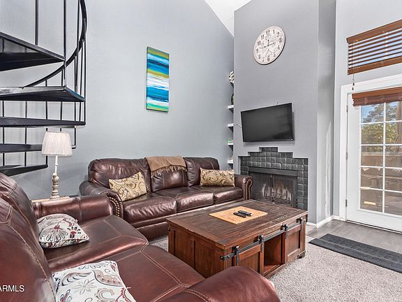 This fully furnished townhouse features a living room with a fireplace, a spiral staircase leading to the loft bedroom/bathroom, and a garage down below. The community pool is just steps away, offering tranquility right around the corner. The home itself invites you into an attractive interior with 2 bed loft living, 1.5 bath, vaulted ceilings, and a modern color palette. The well-maintained kitchen and charming master bedroom promise both a culinary and serene retreat.