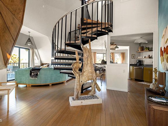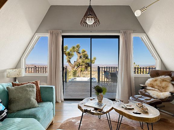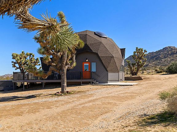This architectural jewel sits amidst Joshua Trees on over two acres in Upper Friendly Hills. 7677 Wilton Rd is a striking Buckminster Fuller-inspired geodesic dome with soaring ceilings, dramatic skylights, and stunning views of the surrounding mountains and desert. The lower level welcomes you with bamboo flooring and a bright, open layout that flows between the living, dining, and kitchen areas. The kitchen features colorful accents and stainless steel appliances, while the spacious primary suite offers a generous bedroom, large closets, and an en-suite bath. A spiral staircase leads to the lofted second level, where two additional bedrooms with unique triangular windows overlook the grounds. A modern bath showcases designer tile and dual sinks, and a flexible bonus room provides extra living space. Designed to capture natural light and frame the desert sky, the dome's wooden hexagonal details and abundant skylights create a uniquely beautiful atmosphere. Outdoors, the property offers a wraparound deck for al fresco dining, a propane fire pit, and a hot tub perfect for stargazing. With thoughtful upgrades including a newer roof, windows and sliding doors, an updated AC condenser, refreshed baths, and a newer hot water heater, this extraordinary home blends architectural wonder with modern comfort. Whether envisioned as a serene family retreat or a one-of-a-kind vacation escape, this desert dome presents the rare opportunity to live inside a work of art.