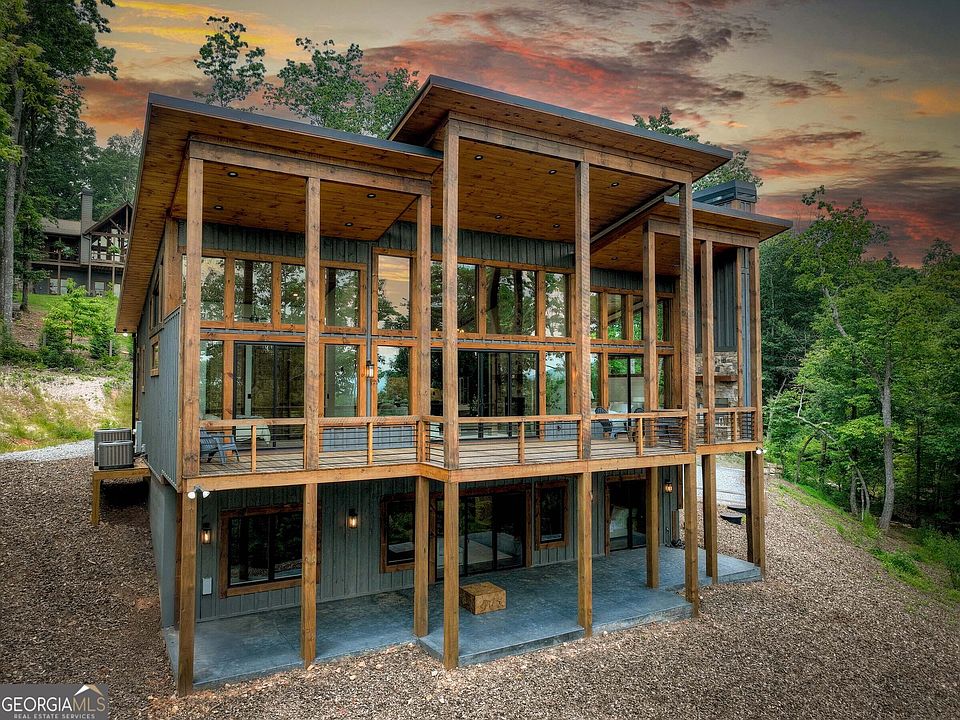 Brand new contemporary rustic chalet situated within lush forestry with gorgeous year-round mountain views and within close proximity to Downtown Ellijay and the most sought-after hiking and biking trails, this new construction creation makes for the perfect retreat! Complete with two levels of open-concept living, stacked stone fireplaces inside and out, large outdoor decks, and luxury king suites! The space is the perfect blend of modern and rustic w/ bountiful natural light and walls of glass in every room. Main level is complete with large kitchen and eat-in island, comfortable living room w/ stacked stone fireplace, large sliding glass doors leading to large deck and fireplace overlooking the layered views. Find two large king suites on the main level w/ their own walk-in closets, tile showers, and dual vanities. On the terrace level, home is complete w/ large den space and fireplace, wet bar, walk-out terrace deck. Within Big Creek Mountain gated community with a private lake. Call today for an exclusive tour of this modern mountain creation today! **Several photos in this listing are virtually staged.**