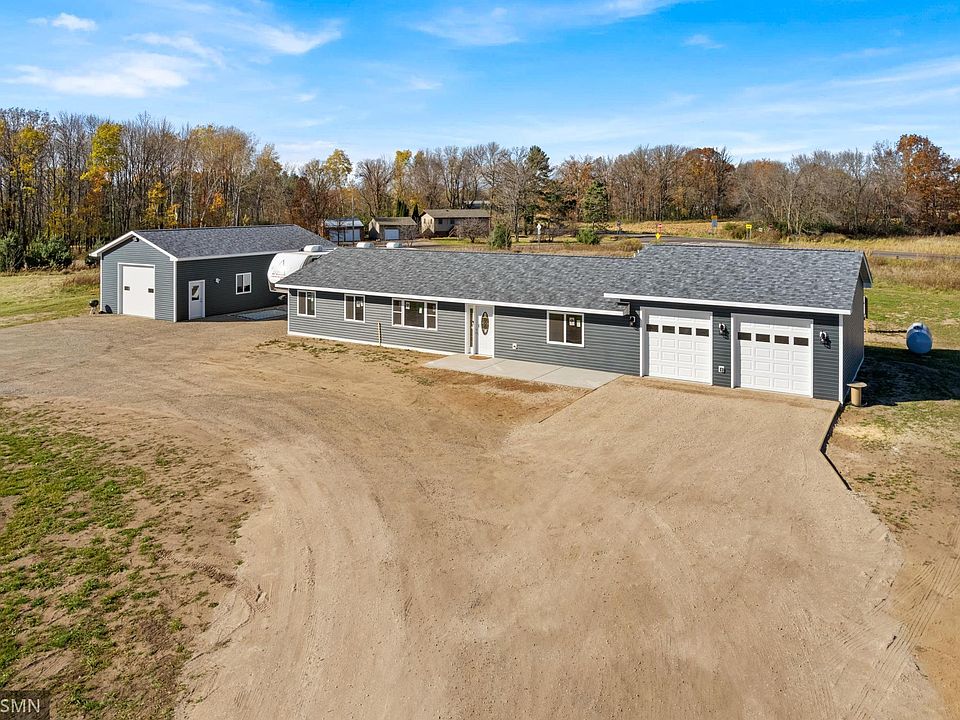 Discover a newly built home that combines modern finesse with a robust design, all set on a 3.3 acre lot featuring a mix of open space and trees. This single-level residence offers 2 spacious bedrooms and 2 full baths, complete with premium touches like forced air heat and central air, solid core doors, 'premium royal estate vinyl siding, premium hi-tech Simonton vinyl windows. Step inside and experience the open-concept layout, where the living area flows into the kitchen, center island that seats up to four. A generous walk-in pantry enhances functionality, providing the practicality everyone appreciates. All in a serene newer development just a couple miles from I-35 for commuting to the metro. This home is an ideal sanctuary away from the daily grind. Enjoy everything brand new. Fully finished heated attached garage with 10' ceiling and 9' overhead doors in addition to the 26x40 stick built shop with 12' ceiling and 10' overhead door, great space for tools, equipment, toys or vehicles, designed for durability and efficiency. Beautiful pond, custom hickory cabinet, stainless steel appliances plus more. Step up and claim your slice of tranquility today!