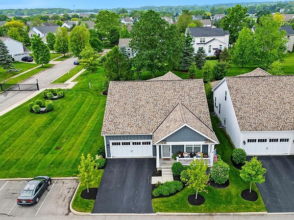 Welcome to 7686 Gateway Blvd in Powell! This ranch freestanding condo with loft has an open floor plan that features a first floor owner's suite, a second bedroom with full bath, study/den w/ french doors, living room with a cozy fireplace which opens to the kitchen with island, bar stool seating and breakfast area. The loft upstairs includes a 3rd bedroom, flex space and full bathroom. Enjoy your morning coffee on the covered front porch with views of the pond or on the private, covered patio in the backyard. The finished basement includes 5 egress windows, an entertainment area, wet bar, full bath, and storage. This end unit is unique and built on a corner lot, so owners can enjoy the green space in side yard and additional parking spots. There is enough space to add a 4th bedroom in basement if desired. All of this plus stress free, low maintenance living. Virtual tour and floor plans included. Call today for a showing!