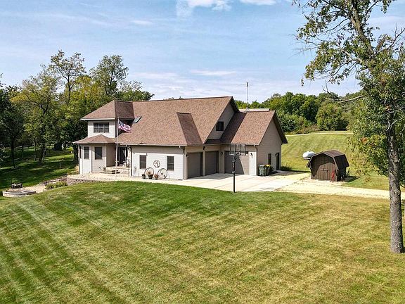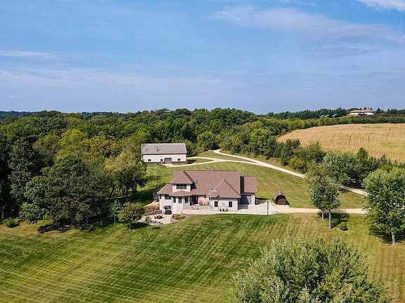 Step inside this impressive custom built 3-bedroom, 3.5 bath home, designed for both comfort and entertaining. The open-concept living area features vaulted ceilings, a formal dining space, and a seamless flow to the kitchen and sun-filled breakfast nook. The expansive primary suite presents a jetted tub, generous layout, and a private walk out to the gorgeous stone patio. Upstairs, you'll find an open loft area, perfect for a home office, reading nook and more. Downstairs, enjoy a large family room complete with a wet bar. Multiple outdoor seating areas create an inviting space to relax or host surrounded by a beautifully landscaped yard and 8.08 acres. Remarkable 40X60 outbuilding offering endless possibilities. Easy commute with Hwy 18/151 just minutes away. It's all here, Welcome Home!