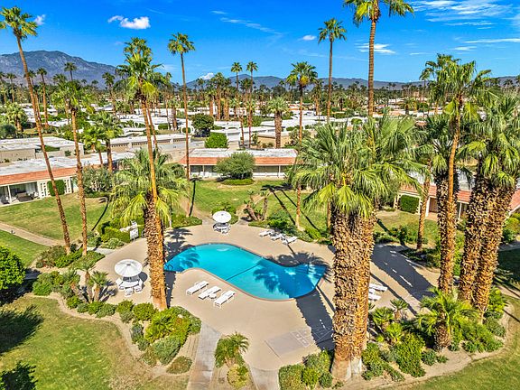 Mid-Century modern furnished Condo built in 1967 designed by legendary architect William Krisel who helped define famous Palm Springs modern architecture. This Indian Wells Country Club Sandpiper Condo has fantastic location, 2 bedrooms, 2 bath, large atrium patio, 2 car garage and 1864 Sq. Ft. of interior living with extended patio overlooking the beautiful pool and mountain views. Walk into light and bright open floor plan with high ceilings, wall of glass sliders in the spacious Great Room, high ceilings, stone fireplace, and built-in custom cabinetry galore. Formal Dining area with views. Kitchen has picturesque south mountain views, light countertops, white appliances, informal wet bar, and seating. Light tile floors throughout; carpets in the bedrooms. Primary Bedroom with walk-out private atrium and mountain views. Primary Bath has light countertops, dual sinks, big walk-in closet, large vanity, and separate toilet area with tub/shower. Guest Bedroom has walk- in closet, and ensuite bath with white tiled shower. Large Laundry Room for extra storage. Enjoy the privacy of Indian Wells Country Club!