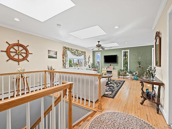 Yearning for your coastal community dream home a block away from Great South Bay? This ready-to-move in hi-ranch home with over-sized entry foyer is located in Lighthouse Point, Village of Lindenhurst. The 2nd level floor plan boasts hardwood flooring, ceramic tile and crown moldings throughout. Custom Anderson windows and skylights highlight natural light in every room. The recently added 16 X 20 outdoor deck only adds to the experience. New main bath in 2024, new roof in 2023, new CAC in 2022. Main level includes cozy den with fireplace, bedroom and full bath. Access to laundry, garage and utilities. Potential for mother/daughter by permit with outside separate entrance. Great pet friendly neighborhood! Minutes from the downtown bustling village, this corner lot home offers close access to Shore Road Park recently renovated, complete with a child's playground and athletic fields on the Bay, along with The Town Marina and waterfront restaurants. Don't miss this opportunity!