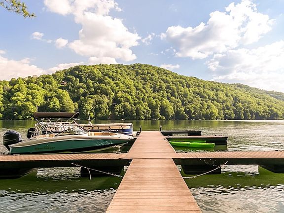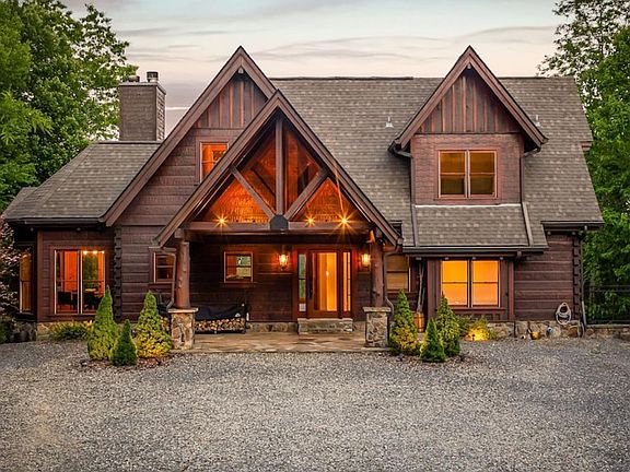 Luxury Log Home with Private DEEDED Boat Slip Crafted from hand-selected cedar logs, this upscale lake retreat showcases exceptional craftsmanship and timeless design. The great room welcomes you with soaring floor-to-ceiling windows, a majestic stone fireplace, and breathtaking views of Lake Nantahala. Step onto the expansive main-level deck, complete with a stone outdoor fireplace—perfect for entertaining under the stars. The gourmet kitchen features stainless steel appliances, granite countertops, and custom cabinetry, seamlessly blending elegance with functionality. The main-level primary suite offers a spa-inspired bath and serene lake views. A beautifully crafted wooden staircase leads to the upper level with two spacious bedrooms, a full bath, and an open loft ideal for relaxing or working remotely. Downstairs, the lower level includes a guest bedroom, full bath, cozy den, and a bonus bunk area for extra sleeping space. Just outside, enjoy a private patio and tranquil backyard oasis surrounded by nature. A private deeded boat slip completes this exceptional offering—your gateway to lake adventures and peaceful living. It's a true must see !