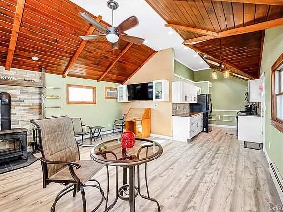 Magnificent Expanded Ranch situated on a quiet block, Incorporated Village, south of Montauk Hwy, entire home redone in 2016, just like a new home. Home was raised 15 ft, 2 ft below grade, 10 ft concrete walls, double sill plates, entire home gutted down to the studs. Great curb appeal with cultured stone, stucco and vinyl siding, vinyl soffits, leaders and gutters, portico, pillars with built-in lighting, 2 sets of stairs with Fiberon high quality. First floor large unfinished room with attached garage, electric, plumbing and walls, also plumbed for bathroom, great potential to be finished. Second floor open floor plan, ski chalet setting, large living room with wood burning stove, vaulted ceiling, pinewood ceiling, ceiling fan, hi hats, arched windows, custom moldings, built-in air conditioner, and vinyl plank flooring. New custom eat-in kitchen with luxe custom cabinets, custom wood Live Edge countertops, ceramic tile backsplash, vaulted ceiling, 2 skylights, pinewood ceiling, upgraded Samsung appliances, gas cooking, refrigerator with ice and water, and built-in microwave. New custom full bath with top walk-in shower, ceramic tile, vaulted ceiling and skylight. Master bedroom with vaulted ceiling, hi hats, ceiling fan, arched window, vinyl plank flooring and loft with storage, second bedroom with wall to wall carpeting, walk-in laundry room with washer and dryer, utility room. Gas heating system, Navian tankless system, baseboard heat, 2 zone heat, toe kick heater for kitchen and bath, 200 amp electric. Oversized 2 car garage, 24 x 24, with lift, separate 60 amp electric, all rewired. Privately fenced backyard, 6 ft PVC fencing, shed, exterior gas line for hook-up for barbecue and heat in garage, large long blacktop driveway with Belgium blocks. Convenient to all transportation and shopping.