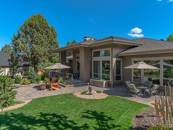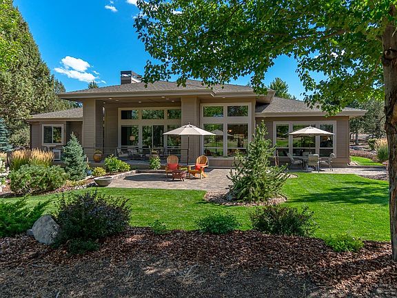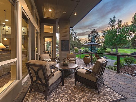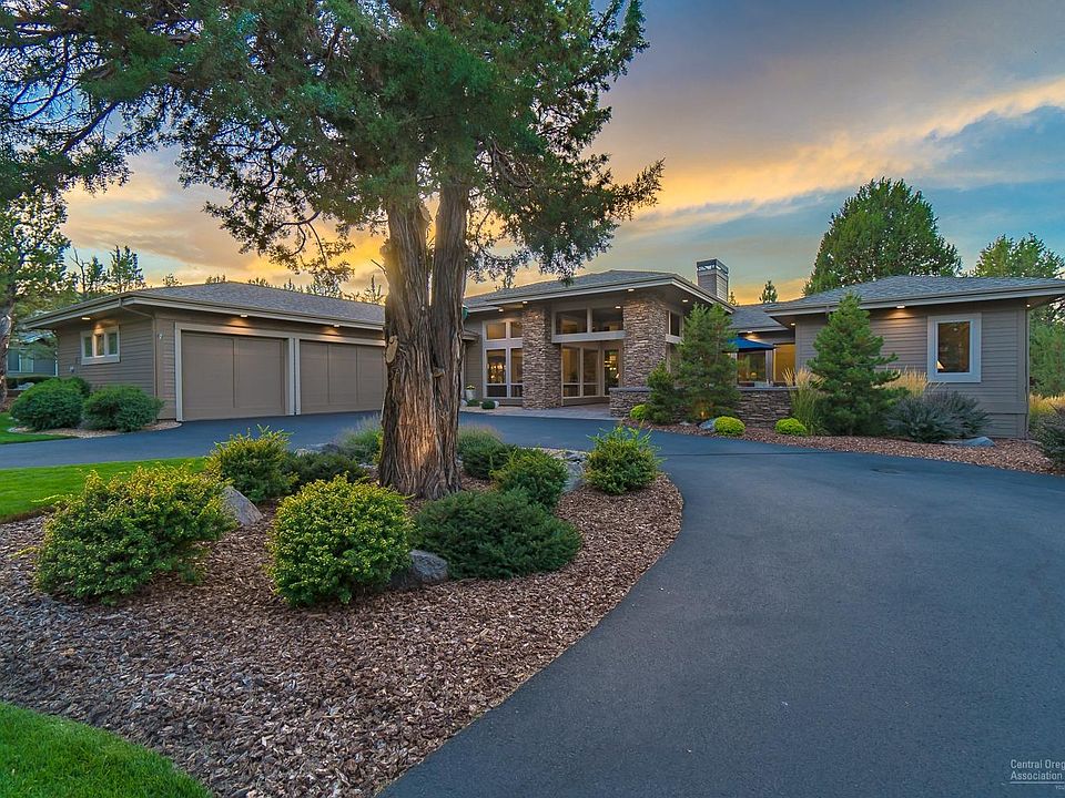 Northwest Contemporary on the 4th fairway of The Ridge Course! Single level home with great room floor plan boasts extensive built-ins, stone accents, soaring ceilings and walls of windows. Gorgeous Acacia solid hardwood floors in the great room, formal dining room, and halls. Gourmet kitchen with slab granite counters on dual islands, built-in buffet, five-burner gas cook-top, and walk-in pantry. Den with floor to ceiling built-ins. Master suite with dual vanity, walk-in shower, soaking tub and spacious walk-in closet. 8' solid core doors throughout. Paver courtyard in front and expansive paver deck with extended paver patio overlooking the fairway. A circular drive provides ample parking for guests. 891 sq ft triple car garage. Eagle Crest is home to three 18 hole golf courses, three sports centers, a spa and miles of trails.