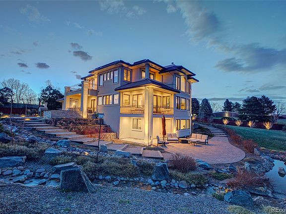 Escape to your own slice of paradise with this stunning custom walk-out mansion nestled on a ridge in Arvada's La Conte Estates, fully enclosed & fenced with an automatic entry gate. Boasting unparalleled views of Downtown Denver and the Rockies from 1.6 acres of private land, this property offers the ultimate seamless living and entertaining experience. With an open floor plan and expansive, bright windows, every space is filled with sunshine and incredible views of the Front Range. Mahogany hardwood flooring, vaulted ceilings, crown molding, and arched doorways create an elegant ambiance in the main level's grand living room, formal dining room with adjoining butler's pantry, home office, library, and chef's kitchen. The primary suite is a true oasis, featuring a Juliette balcony, gas fireplace, walk-in closets, a private patio, and a spa-like en-suite bathroom with a bidet. The second level offers additional bedrooms, a laundry room, and a secret room. The lower level is designed for relaxation and leisure, with a home theater, wet bar, guest bedroom, and ample storage. Step outside to experience spectacular outdoor living with multiple decks, stone paths, two streams, ponds, a fire pit, and mature xeriscaping in the professionally landscaped yard. The oversized 4-car garage offers plenty of space for vehicles and storage. This property is conveniently located near restaurants, shops, recreation, and entertainment with easy access to I-36 and I-70 for commuting to Boulder, Denver, the mountains, and beyond. Don't miss this opportunity to live in luxury and indulge in breathtaking views every day.