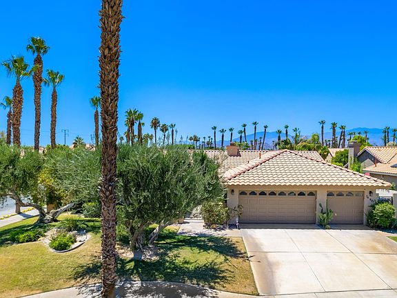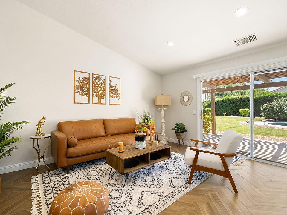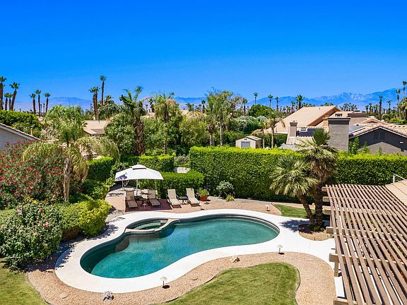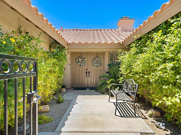 Now available TURNKEY FURNISHED in the highly desirable community of Regency Estates! This immaculate, executive-style home offers a seamless blend of comfort and sophistication, perfect for indoor-outdoor living and entertaining. The beautifully updated kitchen features custom white cabinetry, designer pendant lighting, quartz countertops, GE Profile stainless steel appliances, and a built-in wine fridge beneath the bar. Stylish porcelain wood-look tile flows throughout the main living areas and hallways, while both bathrooms have undergone extensive renovations. The spa-like primary bathroom includes a freestanding soaking tub, sleek walk-in shower, and modern vanity. The guest bathroom also boasts a contemporary walk-in shower and updated finishes. The home is prewired for audio and video, and includes smart thermostats that can be controlled remotely via NEST. Step outside to a spacious backyard retreat with a covered BBQ patio area, a sparkling pool and spa with color-changing lights, integrated speakers, and a lush citrus garden featuring grapefruits, kumquats, sumo mandarins, and navel oranges. The landscaping is mature and well-maintained, and the pool equipment is newer and efficient. Offered turnkey furnished as shown in the photos, this stunning property is move-in ready. Regency Estates is centrally located in Palm Desert close to world-class golf, tennis, casinos, shopping, dining, hiking, and with easy access to the I-10 freeway.