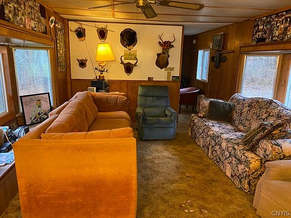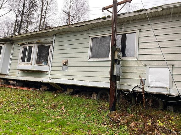 This hunting property includes a manufactured home, woods, and stream on 20.7 acres in Belfast NY.