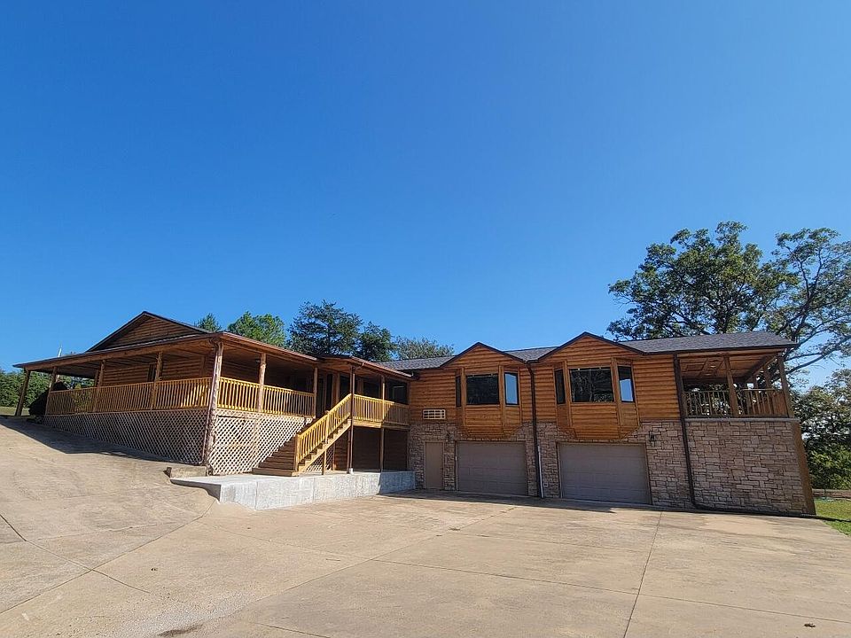 Discover country living at its finest in the Smoky Mountains of the Ozarks with this stunning, newly remodeled log cabin-style home at 7697 State Hwy 176, Walnut Shade, MO. Just 8 minutes from downtown Branson, this property blends serene rural charm with easy access to city amenities. This beautifully crafted 3-bed, 3-bath home boasts three en-suite bedrooms designed for comfort and privacy, plus two well-appointed half baths. The spacious master suite features a private balcony, ideal for morning coffee amid breathtaking Ozark views. Large windows flood the interior with natural light, accentuating the warm, rustic log cabin aesthetic. The expansive dining room is perfect for hosting gatherings, with ample space for lasting memories. Set on a generous 3-acre lot, the property is a haven for outdoor enthusiasts. A large driveway offers plenty of parking, complemented by a four-car garage doubling as an entertainment area with climate control, a half bath, a dry bar, and a non-conforming bedroom with its own climate control, closet, and window. For hobbyists or equestrians, exceptional outbuildings include a 40x60 shop, a carport, a foaling barn, and a 5-bay outbuilding, ideal for projects, equipment, or livestock. A year-round spring flows from a charming 1941 springhouse, adding timeless allure. This home embodies tranquil country living just minutes from Branson's entertainment, dining, and shopping. Whether drawn to the rustic design, modern upgrades, versatile outbuildings, or serene springhouse, this property offers a rare chance to embrace the Ozark lifestyle.