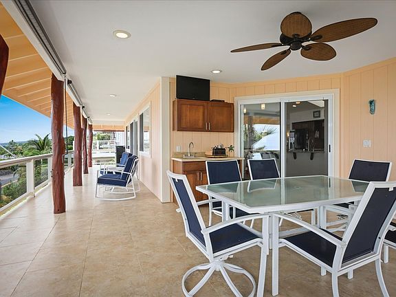 Experience breathtaking ocean views from this unfurnished home on the top floor of a beautiful property in Kainana Sunset. Enjoy unobstructed coastline vistas from the living room, kitchen, master suite, and the expansive wrap-around lanai. The lanai, perfect for relaxing or entertaining, features a wet bar with a refrigerator to elevate your hosting experience.