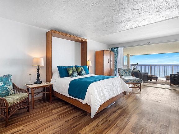 Ocean front condoLuxury flooringRemodeled kitchenGranite countersMaple cabinetsAttached lanaiPark-like shrubs and trees