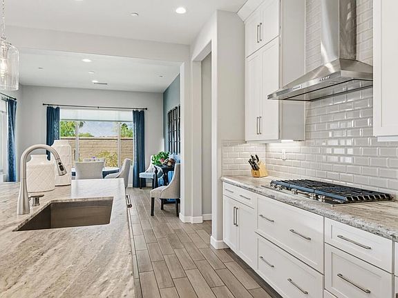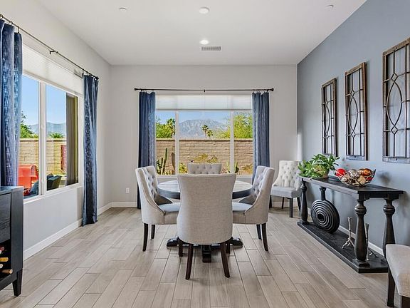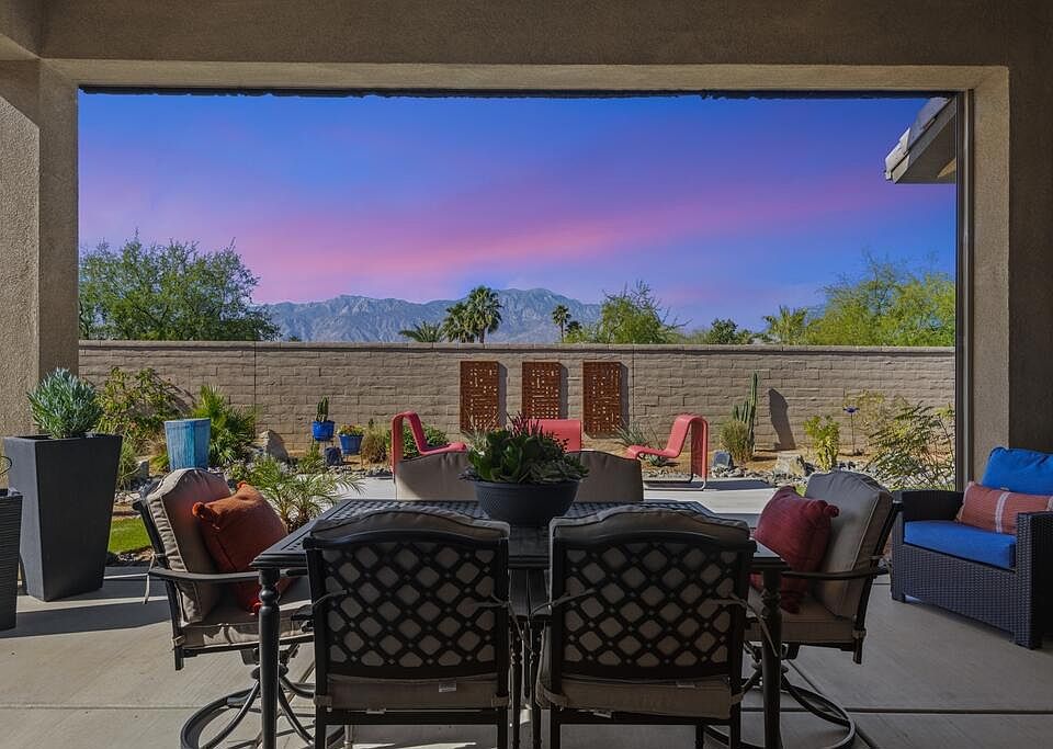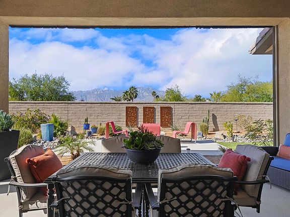 Del Webb Rancho Mirage is the premier 55+ community with walking trails, expanding views and convenient shopping and dining. Residents enjoy a low HOA fee that includes high speed internet, cable and streaming services. Clubhouse, pools, tennis courts, pickleball, putting green, fitness center and endless social activities and events. 77 Barolo Phase 1, Plan 3 Serenity home captures panoramic mountain views- all enhanced by OWNED SOLAR and thoughtful upgrades throughout. Inside, the open-concept layout features two bedrooms, TWO ADDITIONAL ROOMS for a den/office/media rooms, and two baths - Wood-look tile flooring, custom window treatments, tankless water heater and owned water softener. The chef's kitchen is the center of the home with upgraded KitchenAid appliances - including a built-in refrigerator - 42'' upper cabinets with crown molding, and executive island with extra storage, and double-honed granite countertops. The primary suite has quartz walk-in low threshold shower with a bench, dual vanities and a generous walk-in closet. The guest bedroom provides privacy for visiting friends and family. The home also has a Multi panel sliding door in the family room which leads to an outdoor patio with automatic outdoor screens which create an indoor/outdoor living/dining area.Step outside to a stunning, fully landscaped backyard oasis perfect for year-round desert living. Enjoy the panoramic mountain views, gather around the built-in firepit, or enjoy the above ground jacuzzi.