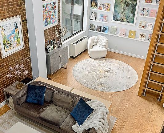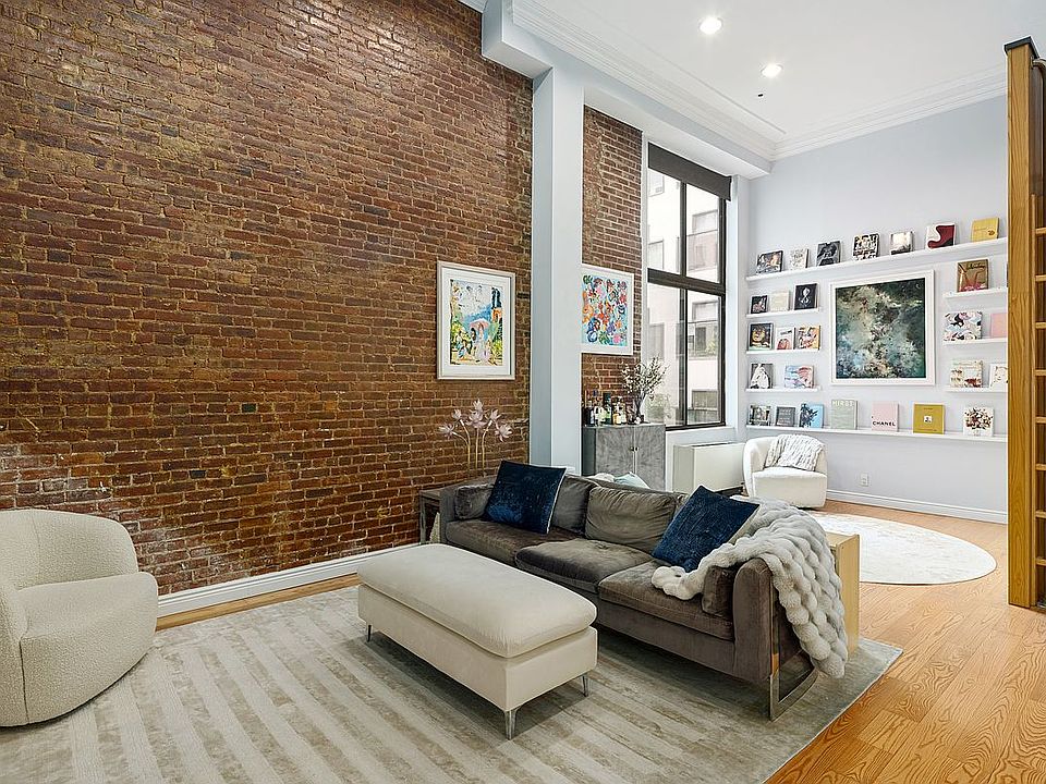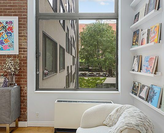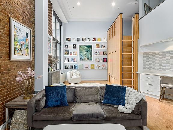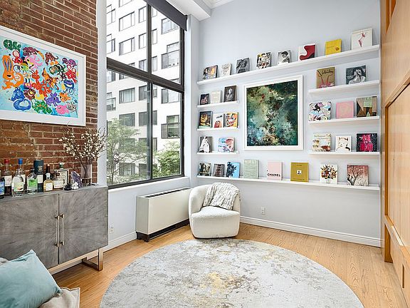 Welcome to 77 Bleecker Street #320, a stunning and architecturally unique one-bedroom, two-bathroom duplex loft in the heart of NoHo. This thoughtfully designed home blends classic charm with modern updates, featuring soaring ceilings, exposed brick walls, oversized windows, and beautiful hardwood floors throughout. The sun-drenched living area boasts double-height ceilings and a wall of curated bookshelves, creating a striking focal point and an ideal space for entertaining or relaxing.