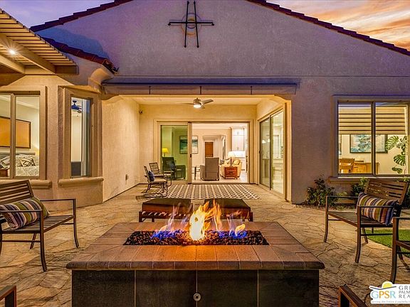 Experience the height of desert sophistication in this Expanded Phase 4, Plan 7 Refuge with classic Spanish facade - an impeccably upgraded home designed for comfort, style, and effortless entertaining. Offering two ensuite bedrooms, a den, and a versatile flex space, this residence blends open-concept living with custom designer touches and peekaboo mountain views. Step inside to discover 12x42" wood-look plank tile flooring, 5" baseboards, crown molding, and custom Hunter Douglas window treatments throughout. Every room is enhanced by high-quality ceiling fans and upgraded LED lighting, creating a bright and inviting ambiance. At the heart of the home, the chef's kitchen is a true showpiece. Enjoy modern upgraded cabinetry with soft-close doors and drawers, 42" upper cabinets with jewel top cabinets and crown molding, sleek brushed nickel hardware, and a full tile backsplash. The KitchenAid appliance package includes dual convection ovens, convection microwave and a built-in refrigerator, complemented by upgraded quartz countertops with triple-height edge detailing. The expansive executive island - complete with pendant lighting and additional storage - anchors the space, seamlessly connecting to the dining and living areas equipped with built-in speakers, a powder room, and coveted tri-panel sliding glass doors that open to the backyard. The primary suite is a serene retreat, featuring the expanded bay window option for added space and light with mountain views. The luxurious ensuite bath boasts a glass-enclosed rain shower, dual vanities with upgraded quartz counters and soft-close cabinetry, brushed nickel fixtures, and a custom California Closets system offering abundant organization and style. Step outside to your private resort oasis - complete with covered patio, built-in speakers, a remote-controlled retractable awning, and thoughtfully designed hardscape and landscape by Teserra. Entertain under the custom Alumawood gazebo with built-in gas BBQ and utility sink, gather around the large fire pit, or unwind in the secluded HotSpring Jetsetter LX Spa while enjoying the mountain backdrop. Premium Belgard Mega Arbel pavers extend across the patio, walkways, and the uniquely widened driveway, enhancing both function and creating unique curb appeal. The home's versatile flex space includes built-in speakers and a walk-in closet, easily adaptable as a third bedroom, media room, or creative studio. The separate den features French doors and a built-in media workspace for added privacy. A well-appointed laundry room offers additional cabinetry, expanded storage, and counter space with a utility sink for convenience. Additional upgrades include a full rain gutter system, smart home package with cameras, Lennox PureAir Healthy Climate Filtration System, central vacuum, Cat6 network wiring, upgraded interior archways, and an insulated, climate-controlled garage with built-in storage, and 220V EV outlet. Located within the prestigious guard-gated 55+ community of Del Webb Rancho Mirage, residents enjoy access to world-class amenities including a clubhouse, fitness center, resort-style pool and spa, tennis and pickleball courts, a full calendar of engaging social events and more! This exceptional home defines luxury desert living - private, elegant, and truly one of a kind.