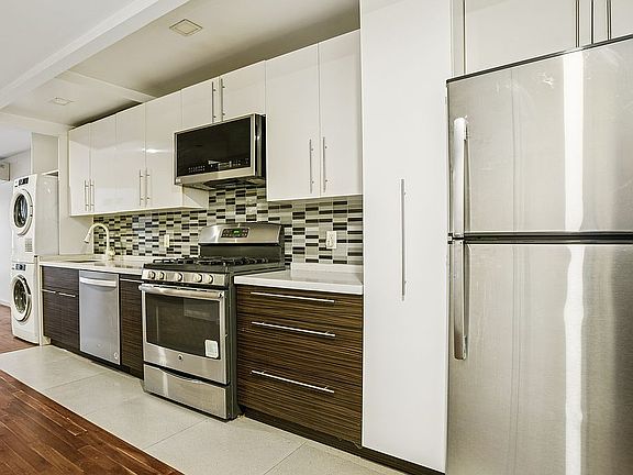 Residence 2A at 77 East 110th Street is a mint-condition three-bedroom, two- full bath home offering contemporary finishes and thoughtful design. A private balcony extends the living space, and the interior features hardwood floors, recessed lighting, abundant storage, and an in-unit washer and dryer. The open kitchen is outfitted with sleek white cabinetry, quartz countertops, tiled flooring, stainless steel appliances, and a dishwasher.