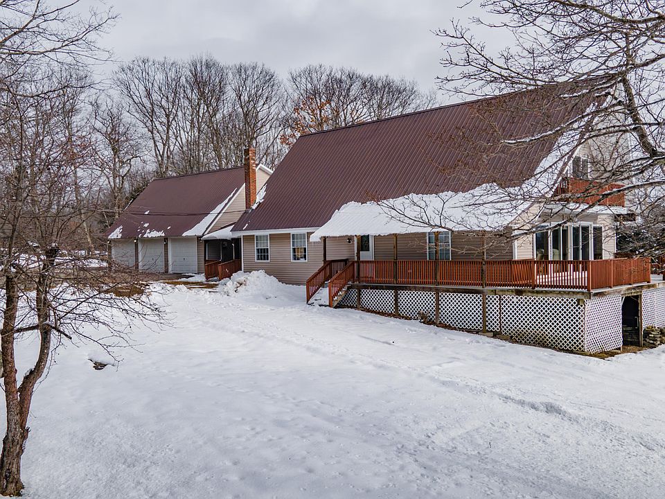Handsome Jefferson Chalet surrounded by stone walls and an awesome wraparound deck. Everything on this house was 'done right' as they say. Attached 5+ car garage with full walkup storage space above, which could be finished off for expansion if desired. That isn't likely though, because as-is this is a wonderfully designed, well maintained home with lots of storage, a large breezeway/laundry area, office area with woodstove, well-appointed eat-in kitchen with gas range and access to a deck, and a massive living room with new plush carpeting. Indoor/outdoor room adds to the already impressive recreational/relaxation possibilities of the home. Upstairs you'll find a large primary bedroom, two other medium sized bedrooms, a half bath and good closet space. Seller to install a new FHA furnace prior to closing with an acceptable offer. Right of first refusal on abutting parcel may be available. On-demand generator. Heat pumps cool the home very efficiently. Two wood heat options, including a pellet stove in the living room which could be converted back to an open wood burning fireplace for someone who prefers ambiance over efficiency. There are many financing options available for this home, including low down payment options with as low as 1% down for qualified buyers.