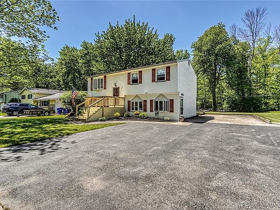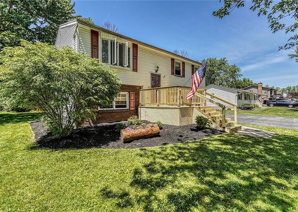 Elmcreek Neighborhood with Spencerport Schools! A completely unique layout for a Raised Ranch! LIVES LIKE A COLONIAL! Enter off the driveway right into the massive kitchen and dining area! Lots of glass! Great for entertaining! The sliding glass door in kitchen leads to the well landscaped back yard and deck! Backyard is your private retreat with the treed backdrop, awesome fire pit, come relax and grill out! Everything at your finger tips-right off the kitchen! Full bath on this floor along with the family room... the adult family room. The kid's living room is upstairs! 3 Bedrooms up and another full bath with tile surround and floors! The replacement windows make cleaning easy, with bay window in the living room overlooking new front deck/stairs! All new landscaping in the front too! Shed is as is. Ages for furnace, roof and hot water tank are unknown. This home flows well, and is waiting for new owners! Plenty of room for a garage too! Beautiful home with wonderful layout! Negotiations after 2:00 on Thursday, 6/11/20.